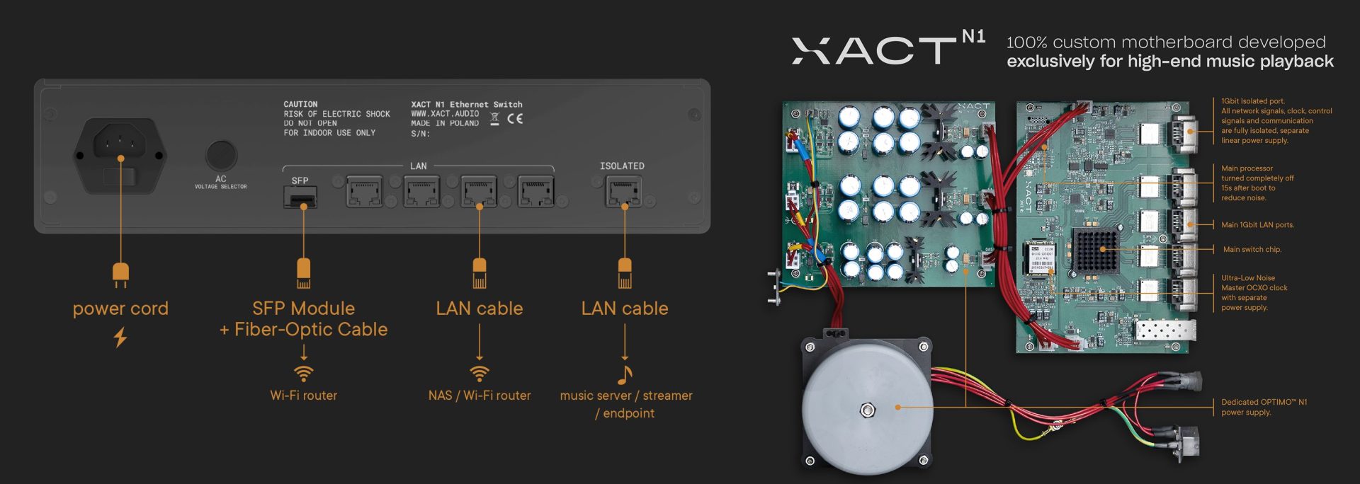 The signal is handled by a processor and a network chip, and controlled by an OXCO ultra-low-noise clock powered by its own current section. Launched this month, the XACT N1 is a top-of-the-range audiophile switch, priced at 6 000 € incl. VAT.