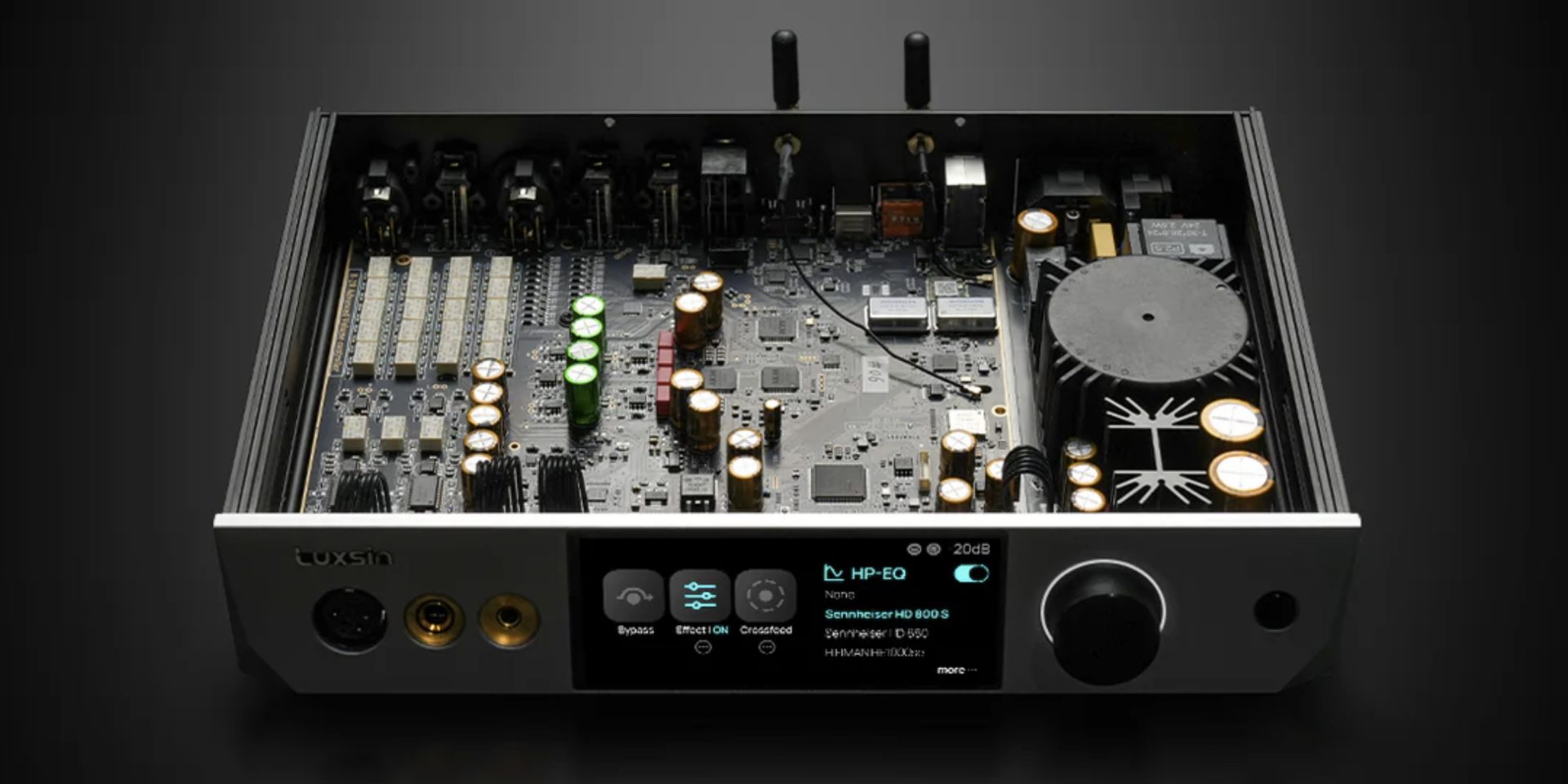Called Luxsin, this first product features two new high-end conversion chips (one AKM4499EX per channel) combined with a delta-sigma AKM4191EQ modulation chip. Destined to become a high-performance headphone amplifier and an excellent analog preamp, the X9 combines three headphone outputs (unbalanced 6.35 mm and balanced 4.4 mm & XLR 4-pin jacks) with fully balanced R2R volume control.