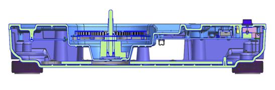 Like its predecessor, it retains a double-layer construction, namely a die-cast aluminum chassis combined with a glass fiber-reinforced ABS structure. The height-adjustable insulating feet use a calibrated rubber spring system to dampen transmission from the support. Dense rubber is also used to cover the inside of the 332 mm, 2 kg platter, with the rest made of aluminum.