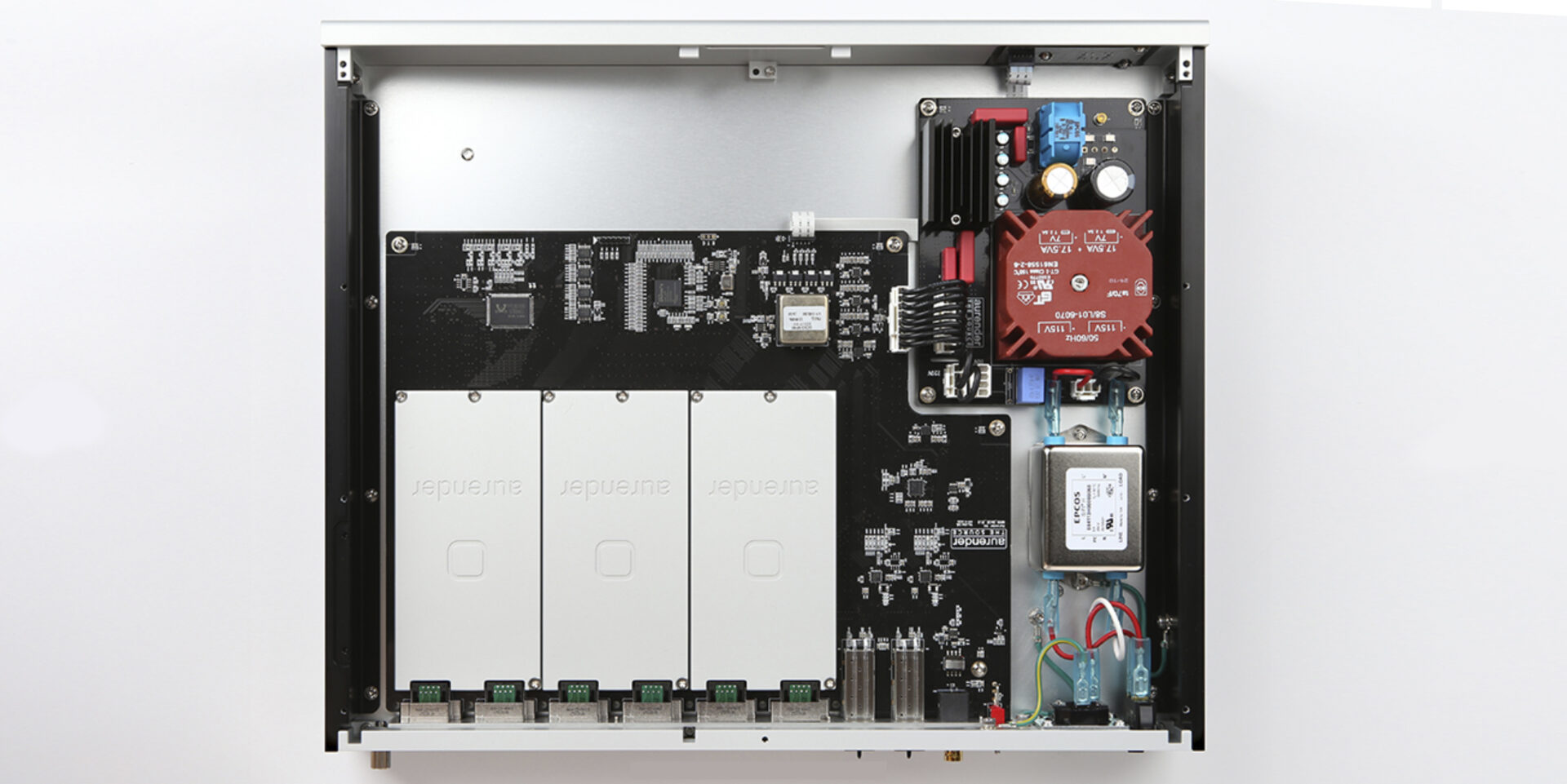 Around a large Bevenbi filter capacitor, the small filter located inside near the vent also incorporates pure copper coils and is designed to process the signal from the rear terminals, which are available with bare cables or banana and spade connectors.