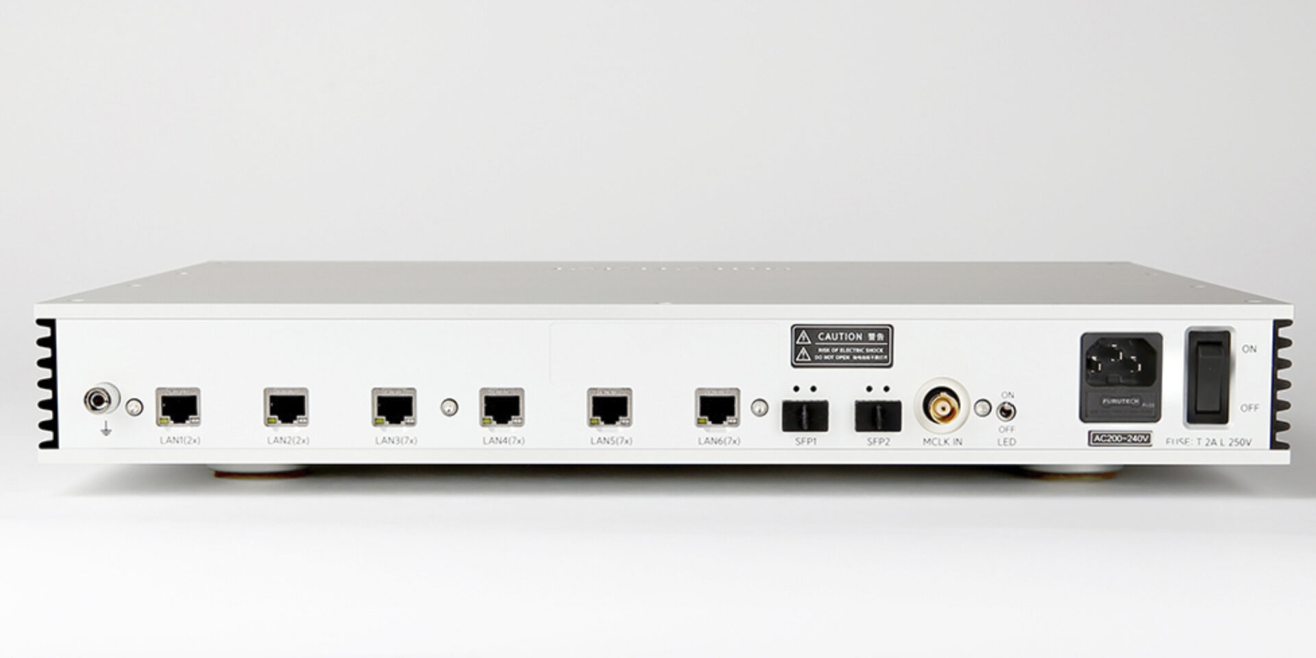 In order to purify data coming from the network, the new NH10 offers six RJ45 (RJ48) ports and two SFP fiber ports, all usable at transfer speeds of 100 or 1000 Mbps. Connected to the box via the first port and then to the network player via the other ports, either RJ45 or fiber, this switch resynchronizes the signal using an OXCO clock with a jitter rate of less than 0.005 ppm. A 10 MHz BNC port can further improve this, with the data also being resynchronized by an FPGA.